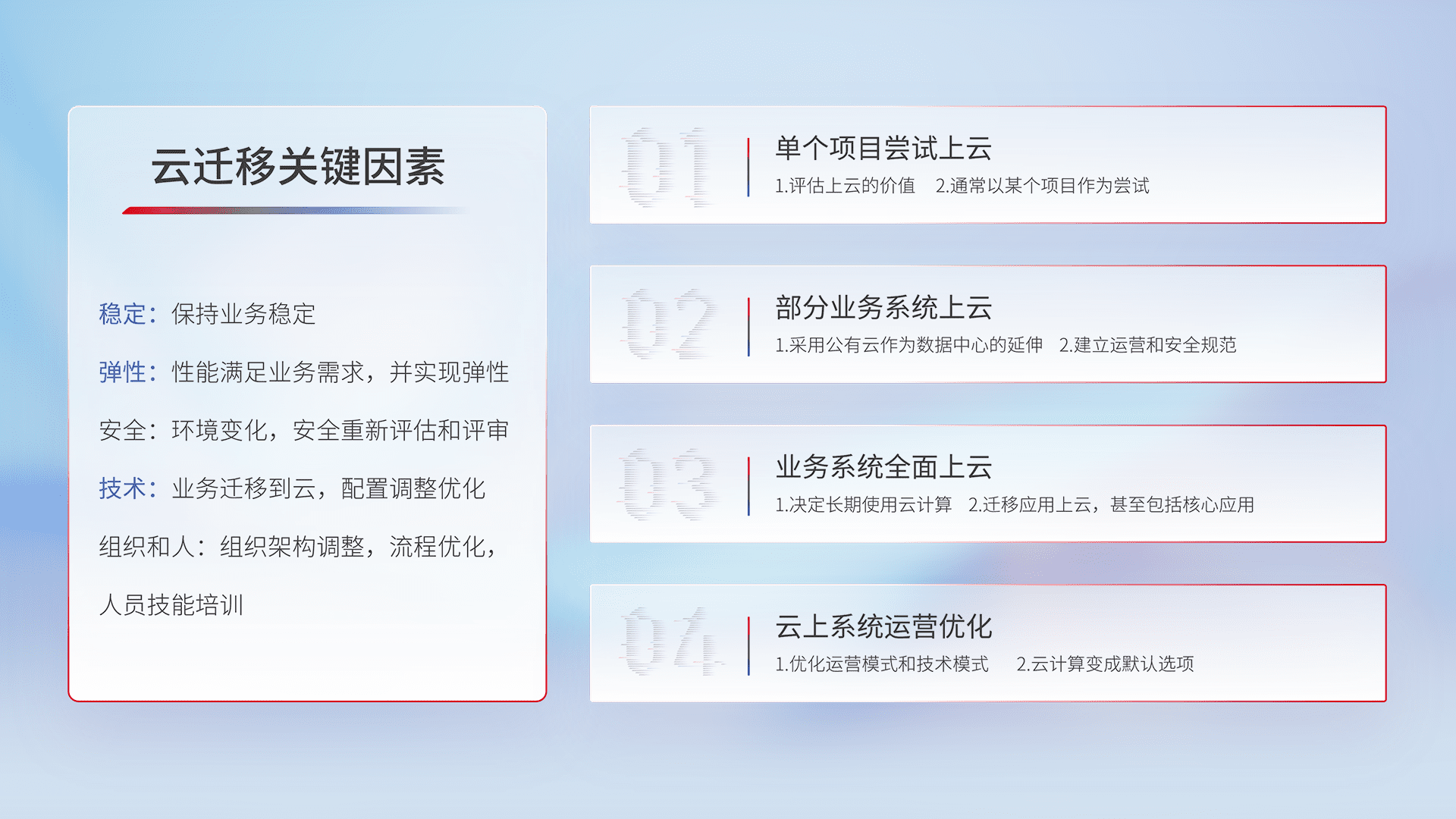 结合实际业务,,,,从规划设计、、、云平台选型、、云原生改造、、数据迁移、、、集成交付,,迁移全过程为客户识别最佳上云路径,,做好风险识别管理,,,,设计网络架构、、、、身份权限、、、安全审计合规、、、操作审计、、日志审计、、、监控告警策略、、、、多站点容灾设计等,,,,对云上基础设施进行整体规划,,提升IT治理水平,,,以满足弹性、、、高可用、、高性能的需求。。。
